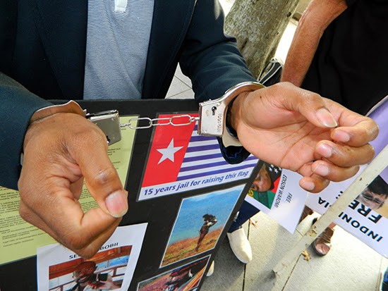 | A West Papuan in handcuffs at a recent “Free West Papuans” rally in Auckland. Photo: Del Abcede/PMC |